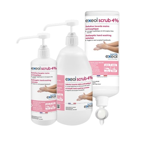 La solution lavante Scrub 4% d’Exeol est spécialement conçue pour